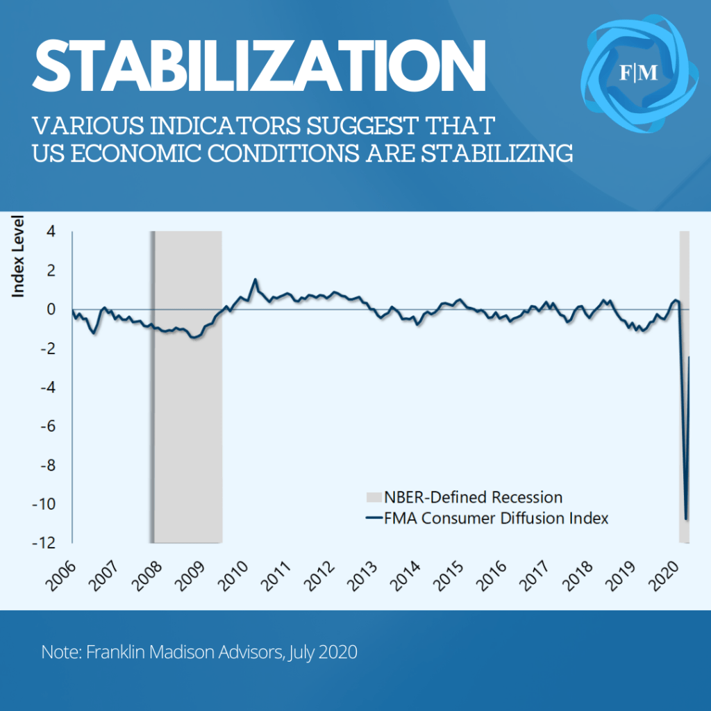 Indeed, there's no question that the US economy is showing signs of having stabilized. Nevertheless, the ongoing healthcare crisis likely will alter household spending behavior and challenge market expectations of a quick economic recovery.