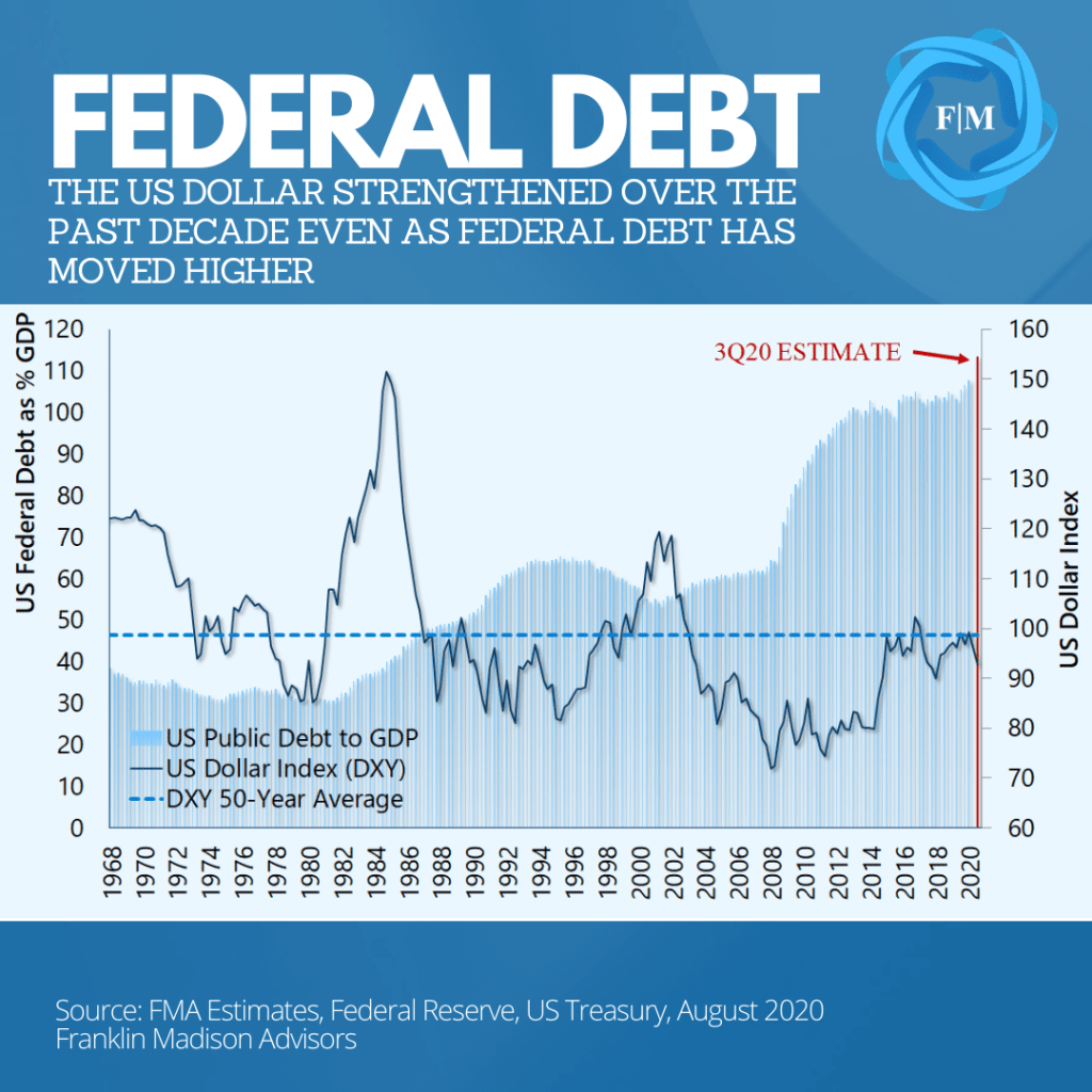 Certainly, during times of financial stress and economic uncertainties, the US dollar is often sought after as a globally secure destination to park savings. This ebb and flow in value is not unique to 2020. In fact, it is evident in prior crises, like in March 2009, amidst the Great Recession and during the popping of the Tech Bubble in 2001. In fact, after appreciating in 2008 and early-2009, the US dollar gave up 13% of its value in the five months following stock market lows in March. And in 2001, even with the events surrounding September 11, the dollar trimmed 4% of its value during the year.