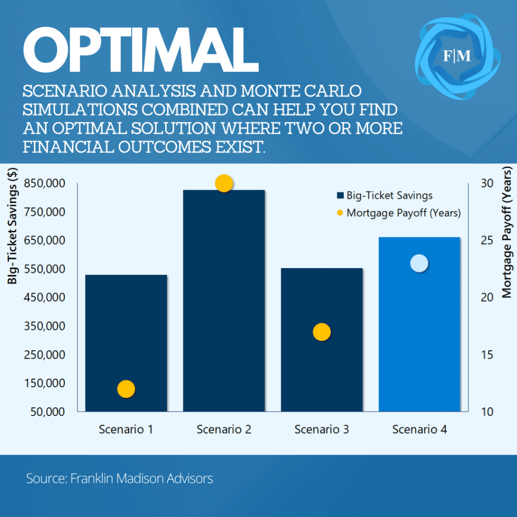 In the third scenario, an even split of savings between mortgage payoff and investment savings over 20 years led to only a marginally higher probability of meeting or exceeding the savings benchmark. However, the Monte Carlo simulations for the second scenario, where we committed all savings to investments, showed a 95% likelihood of achieving or exceeding the $500,000 savings threshold. While a positive solution, you have to consider a critical point: is this the most optimal outcome? Put differently, the mortgage still hasn't been paid off. Let's see how the combination of scenario analysis and Monte Carlo simulations can help.