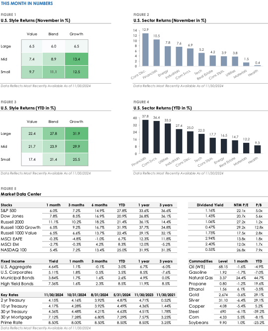 The U.S. presidential election results fueled November’s stock market rally, as investors focused on the incoming administration’s policy agenda and its implications. The S&P 500 gained +6.0%, its biggest monthly return since November 2023.