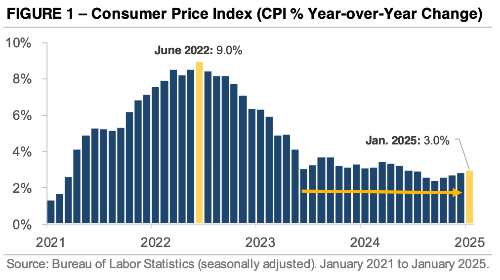 However, in January 2025, inflation picked up again. CPI rose 0.5% from the previous month, marking the largest increase since August 2023. As a result, the annual inflation rate inched up to 3.0%, slightly above December's 2.9%.
