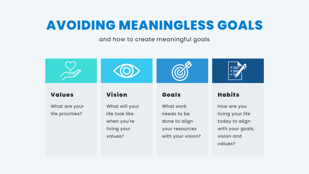 Goals in and of themselves are meaningless. They're simply a means to an end. What gives a goal meaning is its transformative power to shape and change who you are so that you can have the resources you need to experience a life worth living.
