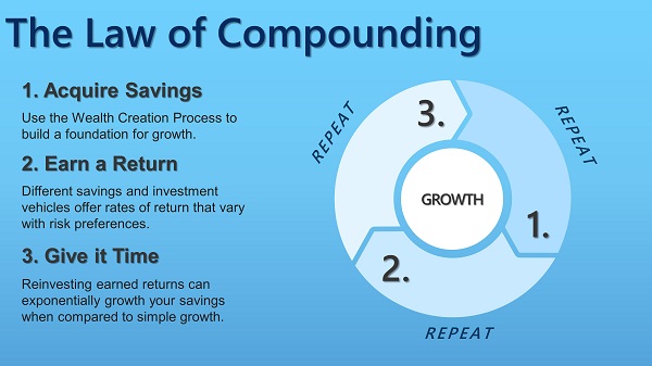 When taken together, you can use the Law of Compounding to grow your money in our current framework. More specifically, we mean earning a return on your savings, then investing that return back into your savings and repeating the process over a given period. Let’s take a closer look at the components necessary to grow wealth.