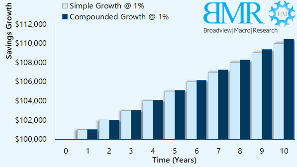 Let’s also assume that your savings is held at a bank and that bank offers you a 1% annual rate of return. So, where does this leave you? Well, in one year, your savings will theoretically grow by $1,000. Therefore, by the end of year one, you would have $101,000 in savings. If you were to repeat this process over a 10-year period, your savings would have grown at a compounded rate by about $10,500 and in excess of $500 more than a simple rate of return.