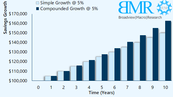 Now let’s assume that we increase your rate of return from 1% to 5%. How would this affect your savings? Well, with $100,000 earning 5% compounded annually the value of your savings would increase to $105,000 after year one and over $110,000 in year two. In fact, after 10 years, the difference between a compounded return and a simple return is nearly $13,000!
