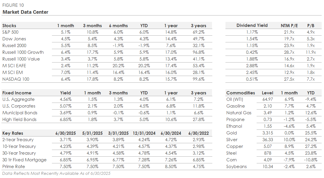 The quarter opened on solid footing. Economic activity had recovered from the tariff-driven volatility earlier in the year, and incoming data pointed to steady consumer and business demand. Job growth was solid, consumers continued to spend, and business surveys showed sentiment was improving. The stock market traded higher in July, driven by confidence that the economy could withstand high interest rates and trade uncertainty without slipping into a recession.