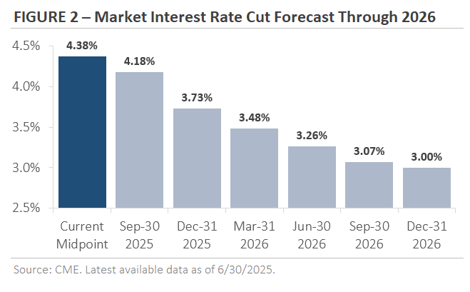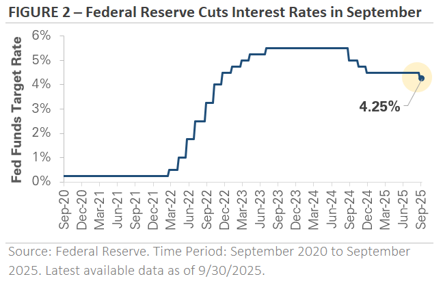 As expected, the Fed delivered a -0.25% rate cut in September, ending its 9-month pause (Figure 2). In his press conference, Fed Chair Powell framed the move as a “risk management” cut, describing it as a proactive step to keep the economic expansion on track rather than concern about a recession. The central bank updated its policy forecast to include two more rate cuts before year-end, with the potential for more in 2026. The revised forecast and Powell’s remarks signaled a measured and gradual rate-cutting cycle rather than an aggressive one.