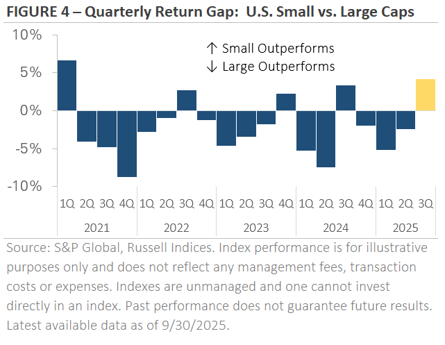 The Fed’s decision to resume its rate-cutting cycle provided another tailwind, as emerging markets, like U.S. small caps, are often viewed as more sensitive to rate cuts and shifts in global financial conditions. In contrast, developed markets underperformed U.S. stocks. European equities ended the quarter modestly higher as they consolidated gains from earlier this year.