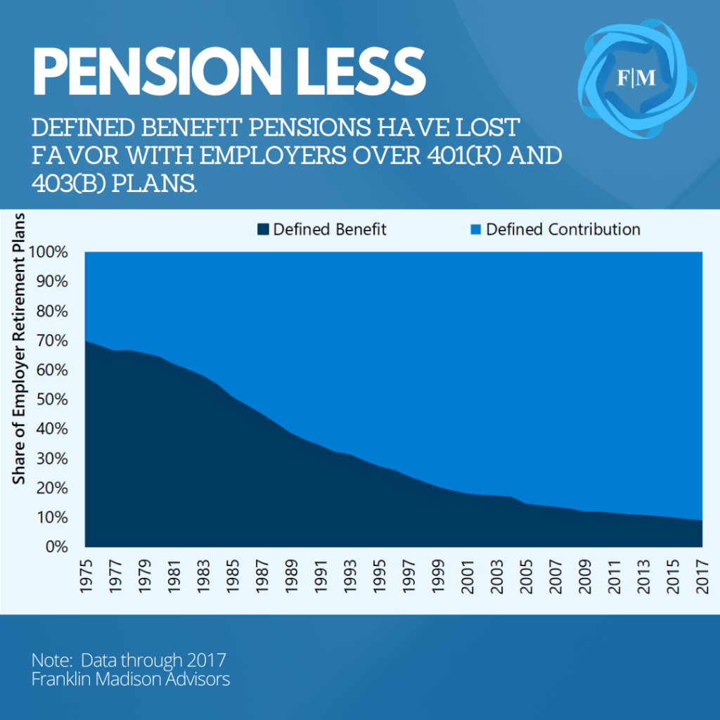 For example, defined benefit pension plans used to be a key component of the three-legged retirement stool. Pensions accounted for 70% of retirement plans in 1975 for companies with 100 or more employees. By 2017, this figure fell to 9% and remains in decline as employers increasingly shift their preference toward defined contribution options like 401(k) and 403(b) plans.