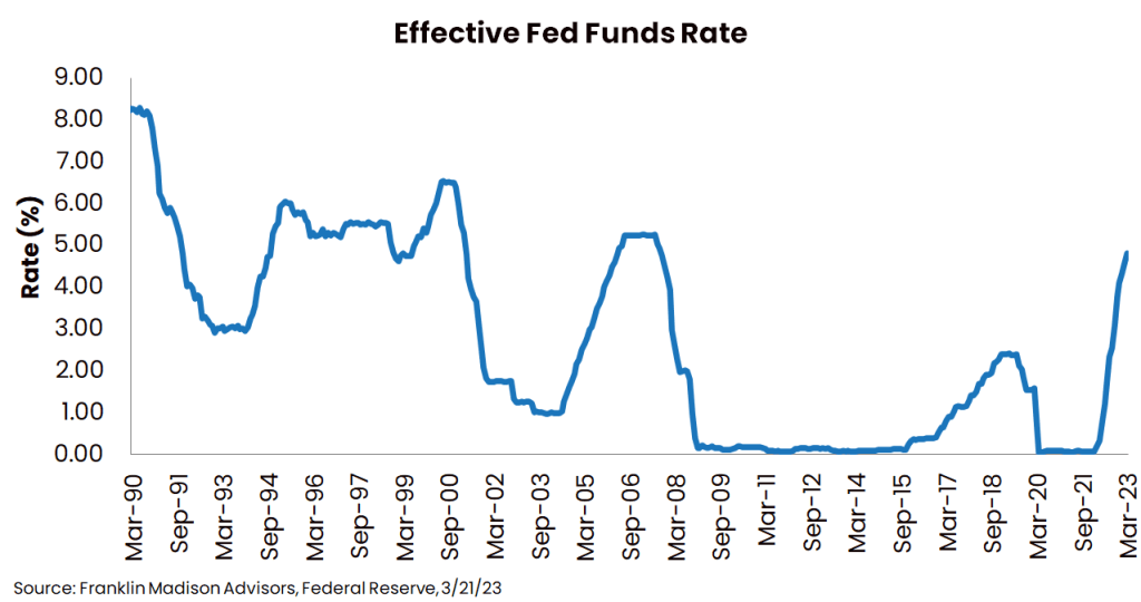 To be sure, according to implied Fed Funds futures coming into the start of this year, market participants expected the Fed to take higher throughout the year before eventually cutting Fed Funds to around 4.25% by December.